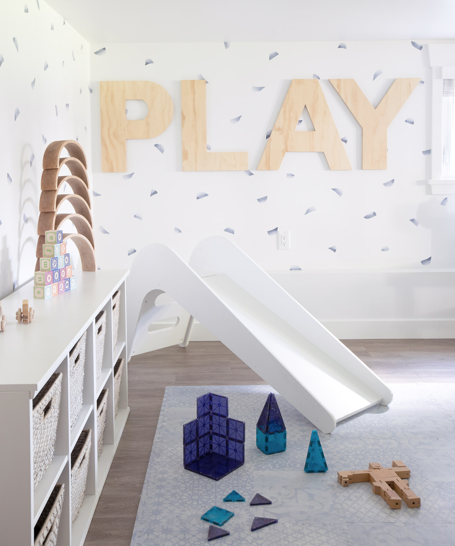 Good storage is key for a playroom and I like using easy-to-pull-out baskets for everyday play toys like blocks, Magnatiles, even puzzles. These storage cubes are at just the right height for toddlers to be able to pull out and put back the baskets themselves, which is always a win! I love that everything in this space is fully accessible for the sweet little kiddos who call this play space home.